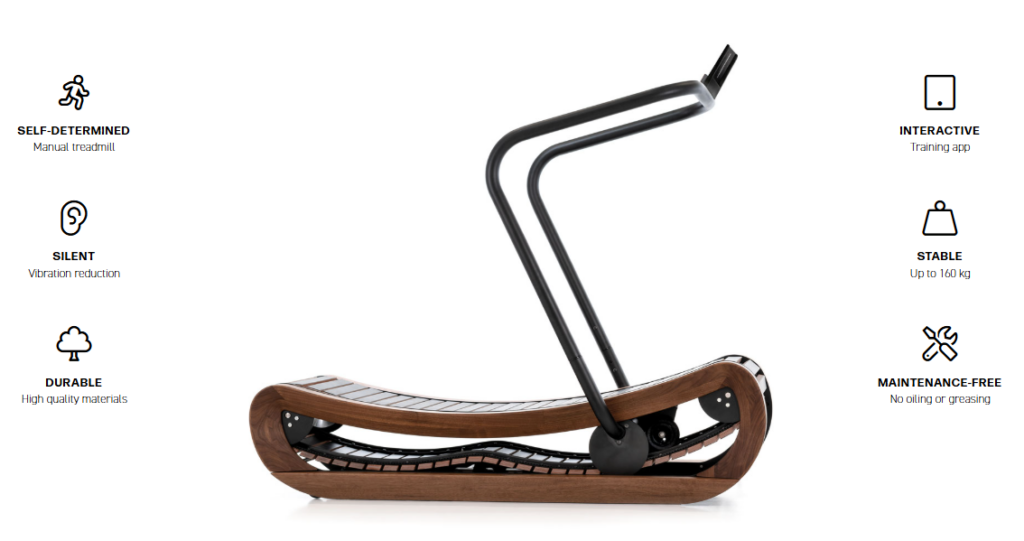 The curved manual treadmill offers users all advantages of a self-determined running or cardio workout: the belt, consisting of flexible wooden slats and precision ball bearing engineering is exclusively powered by the user’s legs. The Sprintbok knows no speed limits nor does it require settings. Infinitely variable from a comfortable walk to an all-out sprint, runners can fully determine their pace according to their personal running capacity.