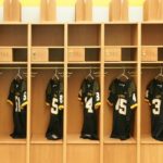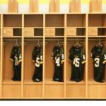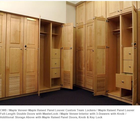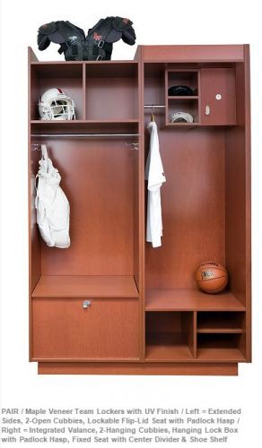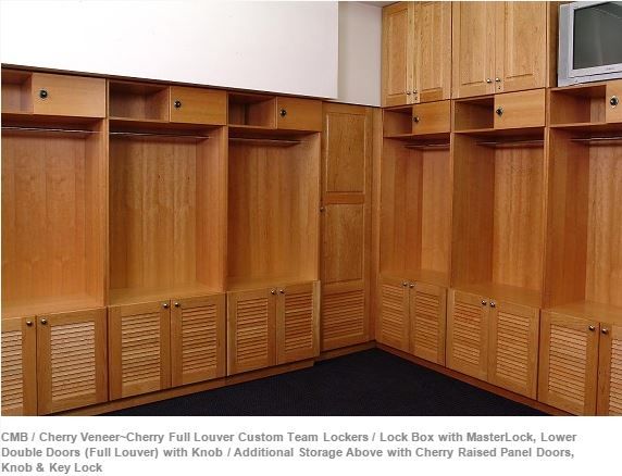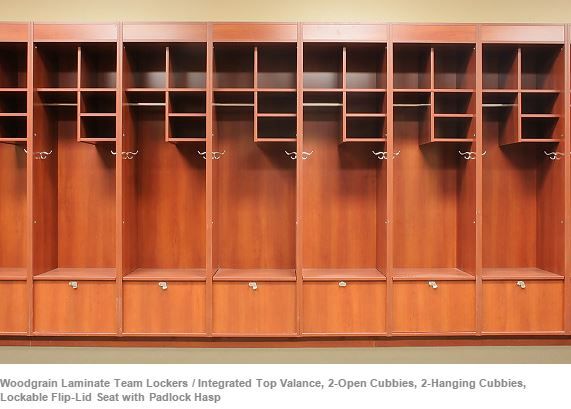 We start with ¾” thick wood veneer, plastic laminate or melamine materials to provide an attractive and long lasting locker. Most Team Lockers have integrated seating; however, your locker can be designed so that the athlete sits inside or in front of the locker. We have even built lockers with integrated mirrors and electrical cut-outs that serve as individual dressing/vanity stations for each athlete.