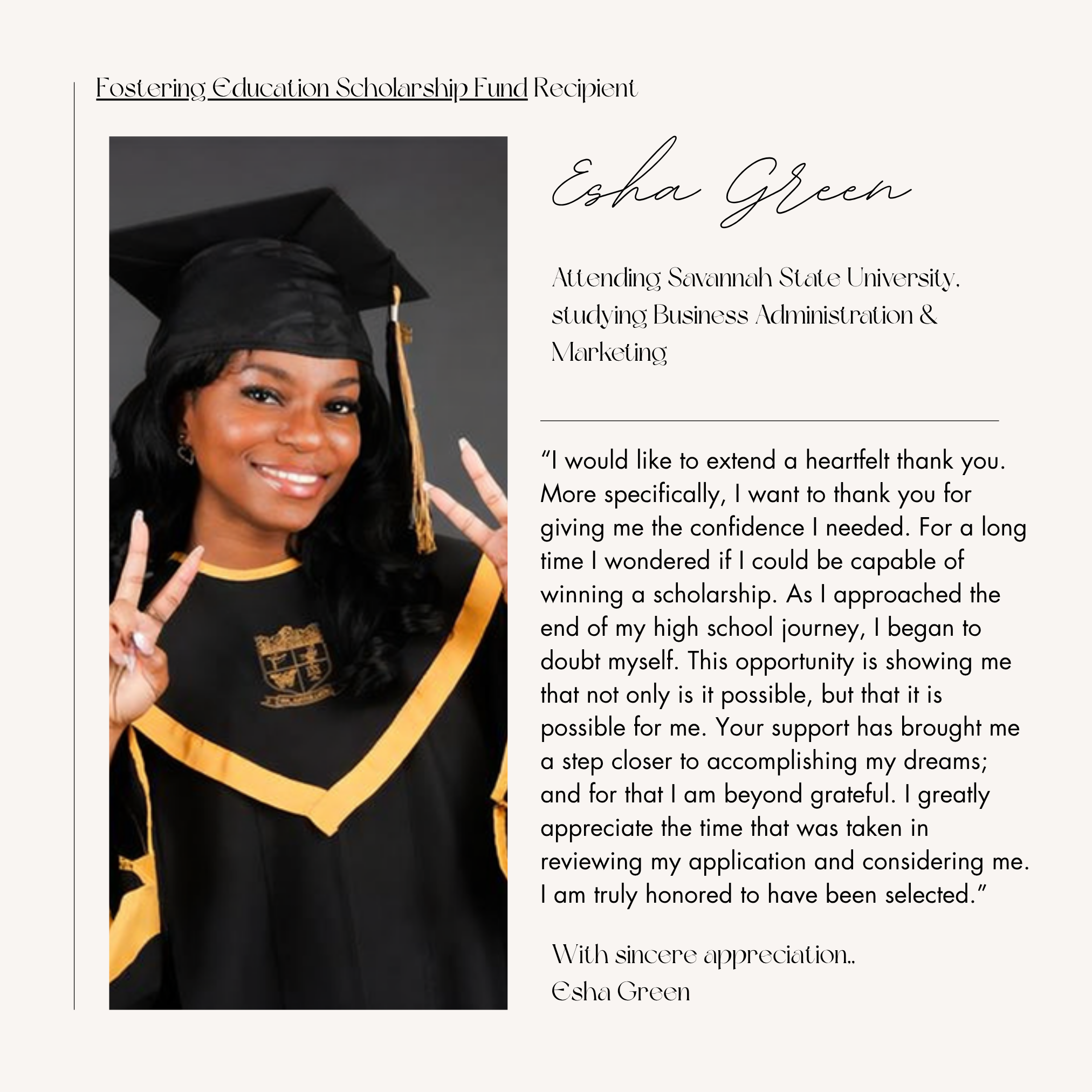 “I would like to extend a heartfelt thank you. More specifically, I want to thank you for giving me the confidence I needed. For a long time I wondered if I could be capable of winning a scholarship. As I approached the end of my high school journey, I began to doubt myself. This opportunity is showing me that not only is it possible, but that it is possible for me. Your support has brought me a step closer to accomplishing my dreams; and for that I am beyond grateful. I greatly appreciate the time that was taken in reviewing my application and considering me. I am truly honored to have been selected.