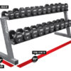 The Long Two-Tier Hex Head Dumbbell Rack is the ultimate rack for storing dumbbells. It is made of fully welded three-by-three inch tubing for extra stability. The two trays are lined with ABS plastic to protect dumbbells and to prevent chipping or scratching of the powder coat finish. The Long Two-Tier Hex Head Dumbbell Rack is sturdy, with a 32-inch lift-over height. There is no better dumbbell storage than a rack by Legend Fitness.